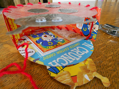 Finally, she threaded the yarn through the hole in the middle of the short end of the rectangle, and back through the middle hole on the opposite end of the rectangle, where I tied it off, to make a handle...