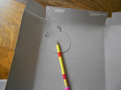 I prepped the craft by tracing out all the shapes we'd need, using the middle of a paper plate, and a couple of lids, as patterns for the ladybug bodies, spots, and heads.